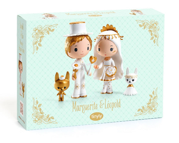 Marguerite and Léopold, the bride and groom, accompanied by their inseparable companions Margo and Léo, form a pretty duo of white and golden figurines belonging to the poetic universe of the Tinyly.