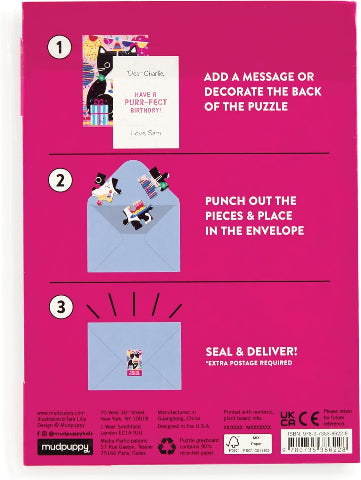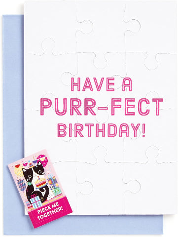 This Purr-fect Cat Birthday Greeting Card Puzzle features an adorable illustration of a birthday kitty celebrating the special day with their very own cupcake.