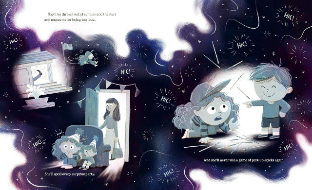 She wonders if she’ll have the hiccups FOREVER. Soon, her imagination runs wild. What if she sets a record for the longest case of hiccups? Will doctors study her? Will babies stare at her? And what if, when she becomes president, the entire world hears her hiccup? But then, she starts to listen to the leaves rustling in the wind and feels the sun on her face. She takes a breath, she pauses, she waits…and the unexpected occurs.