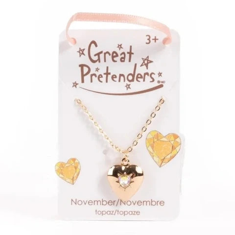This gold-coloured pendant is heart-shaped and features a replica birthstone, hanging from a dainty chain.