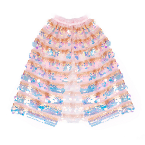Add a touch of radiant elegance to any occasion with The 5th Avenue Pailette Cape, Gold/Pink. A cascade of shimmering gold sequins and oversized light pink paillettes form a stunning striped pattern down the cape, reflecting light with every movement. The alternating sequins create a soft, dazzling effect, while the gathered tulle collar adds a refined, fairy-tale finish.