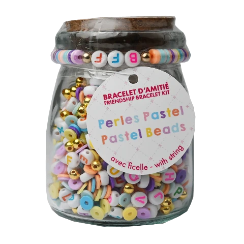 Includes: pastel multi-coloured polymer beads, 1 string (pre-cut), Reusable glass jar with cork.