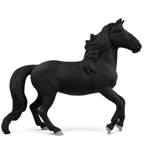 The proud Lusitano stallion looks simply magnificent. The coat shines pitch black from the thick mane, which falls luxuriantly over the strong neck, to the long tail. Only the forehead is adorned with a pretty white-wedge star. No wonder this Portuguese breed was particularly popular at royal courts. Simply majestic!