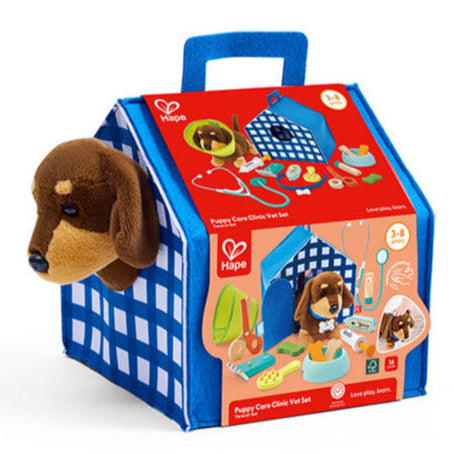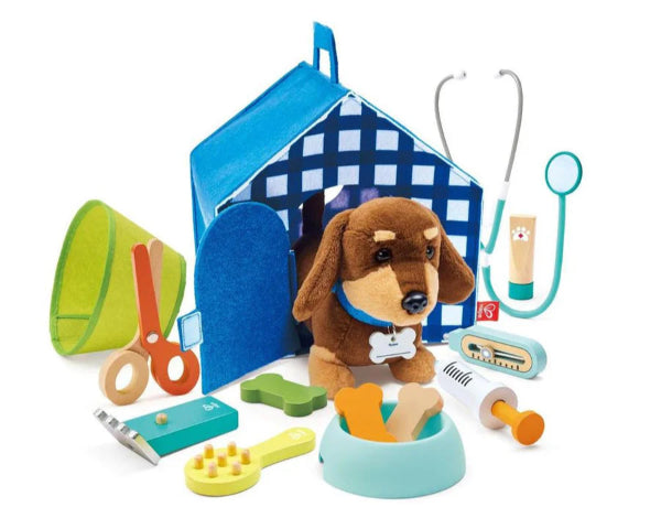 The set includes vet accessories like a stethoscope, syringe, and scissors, allowing kids to explore the tools veterinarians use. A portable dog house with a handle provides convenient storage and transport, while a customizable name tag lets children personalize their pet.