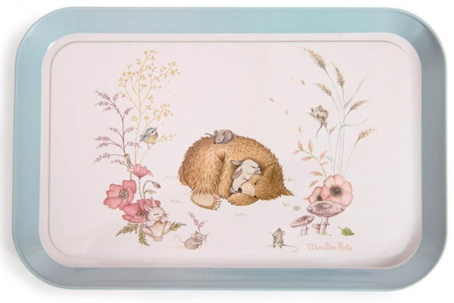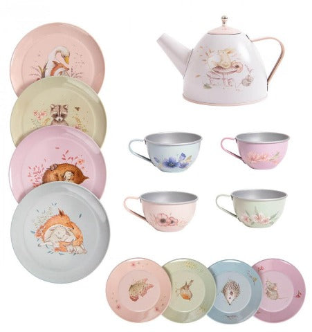 This beautiful metal tea service comes a carry-case illustrated with sweet flowers and animals.