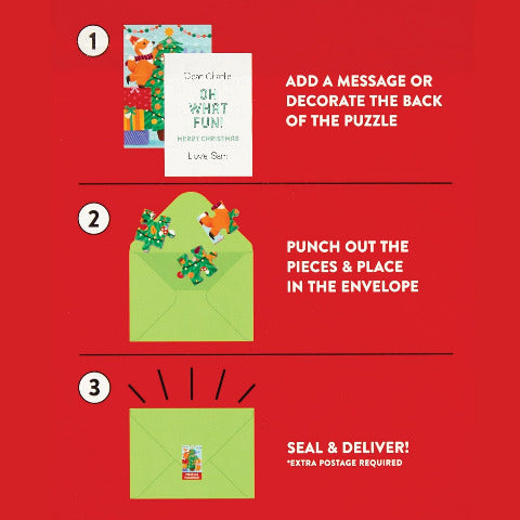 Christmas Critters Greeting Card Puzzle from Mudpuppy is a 12-piece postcard puzzle with an image of animals decorating a tree on one side and space to write a message on the other side. Package comes with puzzle put together, write the message on back, break up the pieces, place in the envelope and mail.