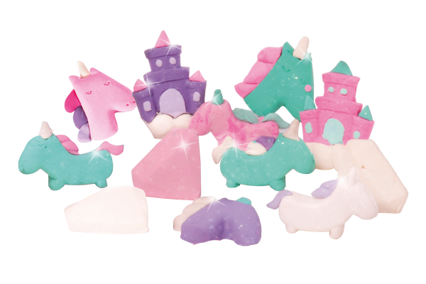 With three tubs of deliciously-scented and sparkling coloured modeling dough, castles, shooting stars, hearts, rainbows and unicorn figures can be made to create a very magical and glittery activity. Ideal activity for parties and sleep overs. And don't forget to blend the dough to obtain new colours and scents.