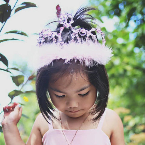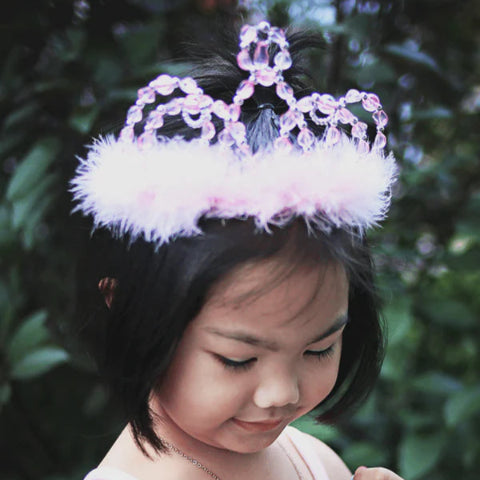 Transparent pink beads with silver accents intricately weave and form this Princess tiara. A pink, ribbon-wrapped base is further decorated with pink marabou, and clear combs. This Princess tiara matches everything, even pyjamas because princesses need sleep too.