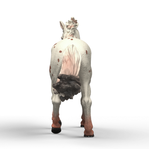 The elegant Knabstrupper mare has a white coat with brown spots. Her mane and tail are also white with a few brown strands in them. The pretty coat pattern is particularly effective when she gallops dynamically