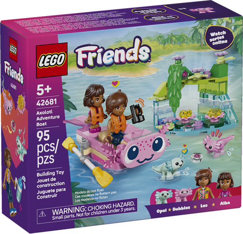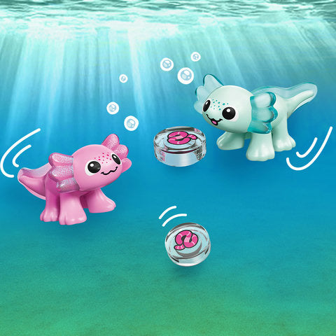 Let’s go spot axolotls with the LEGO Friends Axolotl Adventure Boat! Join Leo and Alba as they sail out to find the friendly creatures. The cute boat comes with oars and 2 life jackets and features an axolotl face and a wobbling tail. Look! Here are the 2 sweet axolotls playing among the plants and flowers. What a fun boat trip!