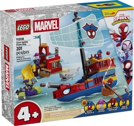Set sail on a Spidey pirate adventure! Help Spidey steer the pirate ship, fire the cannon, and stop Green Goblin from stealing treasure. Ghost-Spider guards the island with her shooter and water blaster, while Spin patrols the sea in his tub. After a busy day of pirate action, the whole team gathers on the top deck for a hot dog and a drink! Join Spidey’s crew for web-swinging, sea-splashing fun!