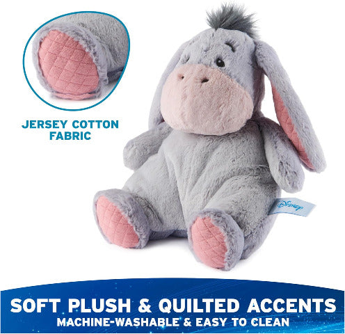 This understuffed, huggably floppy Eeyore stuffed animal features soft gray plush with pink embroidered accents and a pink bow on his tail. Eeyore also has soft quilted cotton jersey textures on his feet and ears.