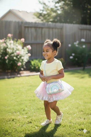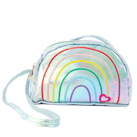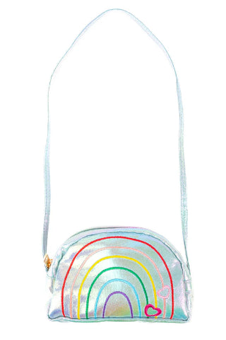 Crafted from shiny blue metallic material, this cheerful crossbody features an embroidered rainbow and colourful hearts on the front for a sprinkle of joy in every step. A secure zipper along the top keeps treasures tucked safely inside, while the long strap makes it easy to carry on outings, playdates, and all kinds of magical missions!