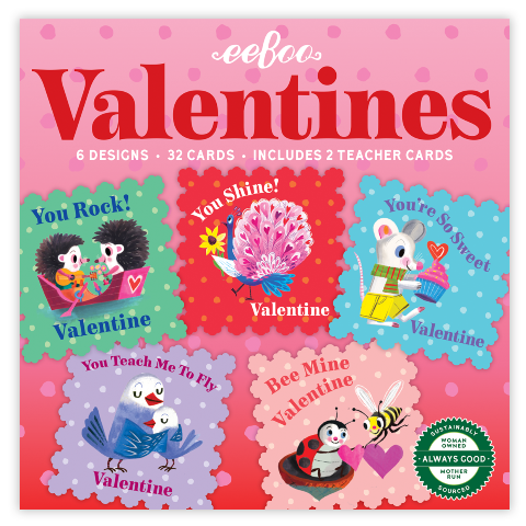 The pack contains 32 Valentines, including 2 teacher cards. There are 6 different designs on the front, and a decorated back to address your well-wishes.