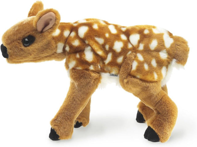 The sweet-and-gentle Fawn puppet is adorably designed - from its soft vinyl nose down to its soft vinyl hooves. Big black eyes and silky spotted fabric 'fur' details complete the realism of this hand puppet.