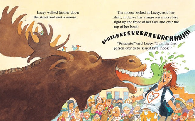 On the way to school, Lacey meets a cat, a dog, and an eagle. They all read her T-shirt, then give her a kiss! Then she meets a moose, who gives her a large wet moose kiss, right up the front of her face and over the top of her head. Lacey is thrilled - maybe this shirt is wonderful, not weird! But when her classmate reads the shirt and gives her a peck on the cheek: YUCK! BOY KISS!