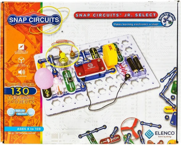 Snap Circuits makes learning electronics easy and fun! Snap Circuits uses building pieces with snaps to assemble different electronic circuits on a simple rows-and-columns base grid that functions like the printed circuit board found in most electronic products. Each component is easily identifiable by a different colour and functional purpose. The Jr. Select set has 133 projects outlined in the colour project manual. The projects use a glow-in-the-dark flying propeller, phototransistor, LEDs, resistors, ICs, a DC motor and much more.