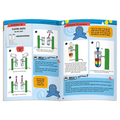 The quick and easy experiments in this set playfully introduce children to fascinating natural phenomena. With Blobert - a small blob-shaped figure with googly eyes they create in the first experiment - as their guide, curious young minds can safely and confidently explore different aspects of this fundamental science including surface tension, solutions, mixtures, density, buoyancy, and more. Cast slippery alginate shapes, blow iridescent soap bubbles, create a rainbow in a test tube, and make grapes dance!
